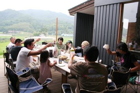 棟梁の佐藤大工ご夫婦、加藤大工、秋葉大工、Mさんご家族、主人と私、そして後から家具作家の伊藤圭君が集まりました。