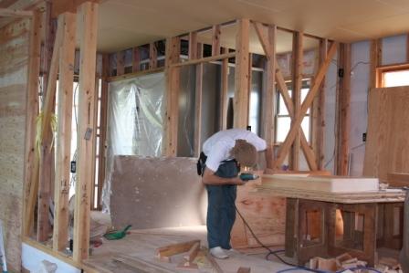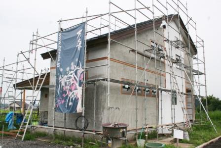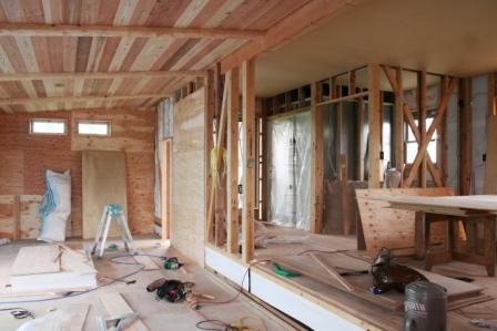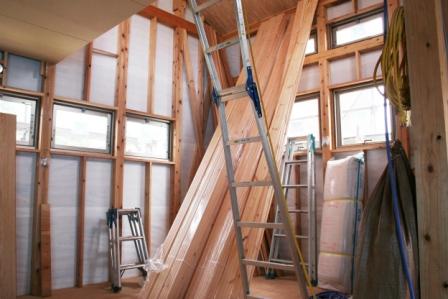 2階では篠崎大工が何かを張っているような音がしたので、たてかけてあるパイン材を床に張っているのだと思います。