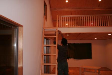 引き渡しは24日と決まり、佐藤大工が収納スペースへ上る梯子を造ったり、残っている細かいところの施工をしました。