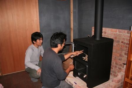薪ストーブはピーキャン社のベーカーズオーブン、伊藤叔潔さんが積んだレンガにぴったりおさまりました。